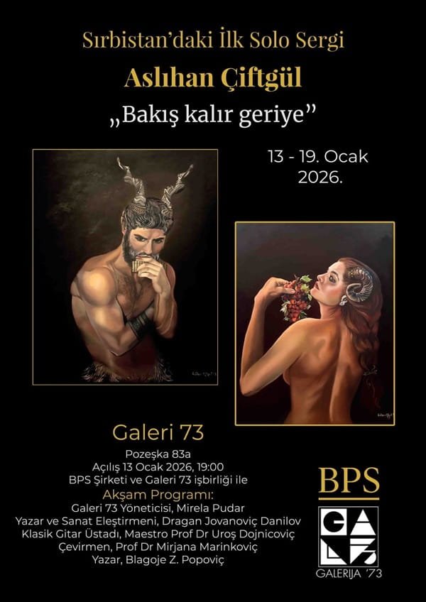 Ocak 2026’da kapılarını açan sergi, 23 yağlı boya eserden oluşuyor. Serginin açılışını, evsahipliğini üstlenen BPS Şirketi kurucusu Blagoje Ž. Popović yaptı. Etkinlik, Sırbistan’ın önde gelen gitar maestrolarından Prof. Dr. UrošDojčinović’un ‘Türk Marşı’ ile başlayan repertuarıyla konuklara sunduğu etkileyici performansla devam etti. Açılışa, ünlü şair RadomirAndrić başta olmak üzere, çok sayıda kültür ve sanat insanı katıldı; sergi, sanat ve kültür dünyasının dikkat çeken bir buluşmasına dönüştü.